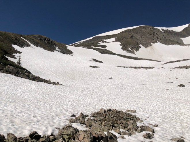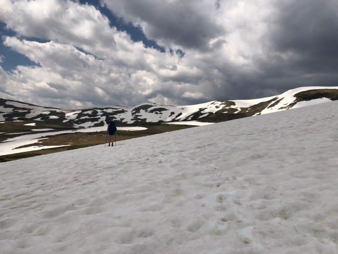 Spotty snowfields dotted the high alpine environment like a large mountain Dalmatian. Much of it could be avoided, but at other times you found yourself falling up to your hips through the high snow drifts.